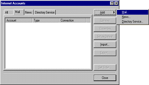2. In the popup Accounts screen click on the Mail Tab then click on the Add button and pick Mail. |