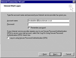 6. In the Account name box enter your email Account Name. In the Password box type in your email password. Click the Remember Password checkbox. Click the Next button.
